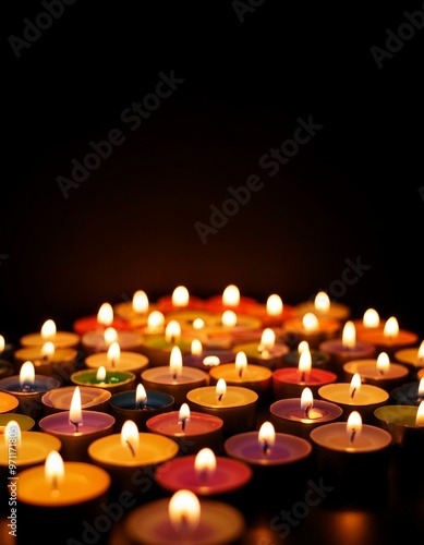 Burning brightly candles in the dark shadow, space for text romantic colorful concept background