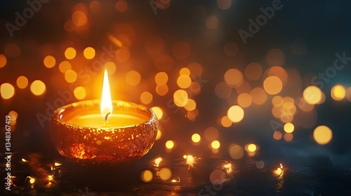 Burning Candle in Golden Holder with Bokeh Lights Glowing Softly
