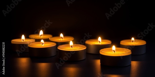 Burning candles arranged neatly in the dark create a soothing ambiance. The burning candles illuminate the surroundings, enhancing the atmosphere with their gentle glow.