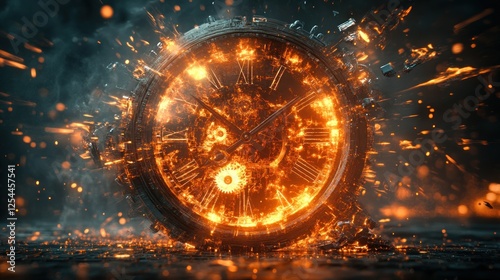 Burning clock exploding, dark background, fiery destruction, time concept