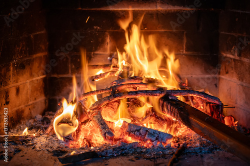 Burning firewood in a fireplace, vivid burning orange and yellow flames.