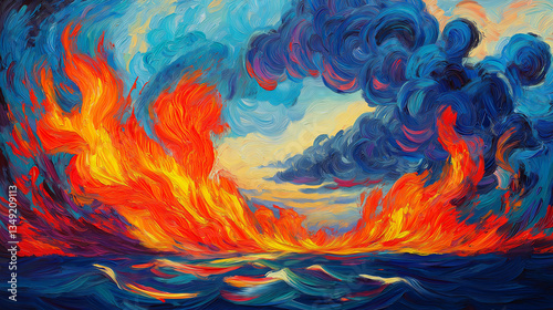 Burning flames in oil painting style
