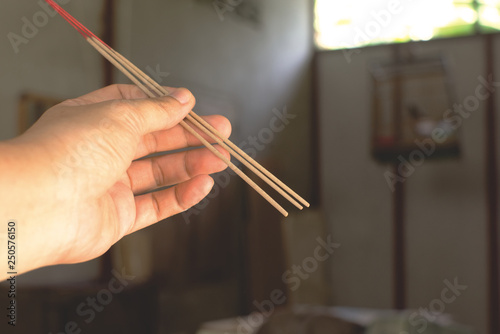 Burning incense in hand of woman.Close up