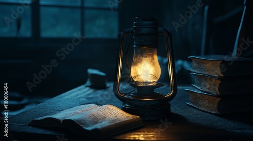 Burning lantern in the night on table.
