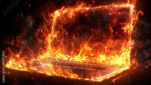 Burning laptop engulfed in flames against a vivid backdrop for striking visual impact