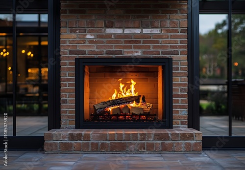 Burning Log Fireplace with Brick Surround and Metal in Modern Home