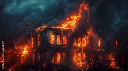 Burning property with flames raging through broken windows smoke spilling into the air chaos and heat dominate