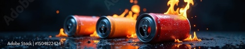 Burning soda cans, dark background, liquid drips, metal, illustration, texture