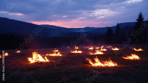 Burning uprooted trees for land preparation in construction project against a scenic sunset landscape