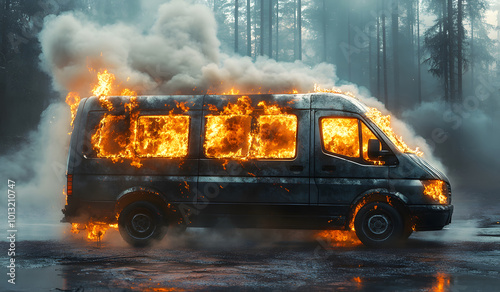 Burning van with flames and smoke design, isolated on a blue background design