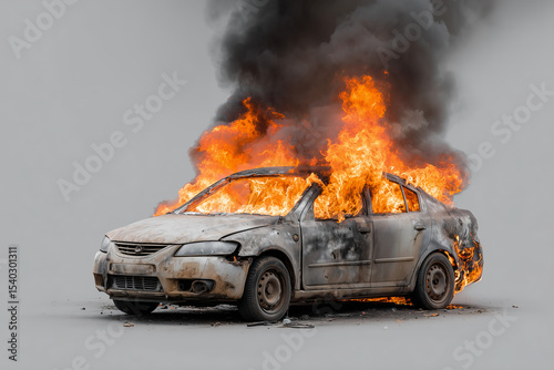 Burning vehicle engulfed in flames against a gray backdrop with smoke billowing high into the air, illustrating a dramatic scene of destruction and chaos