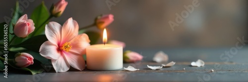 Burning white candle and delicate flower, minimalist condolence card design , white background, white candle, solace