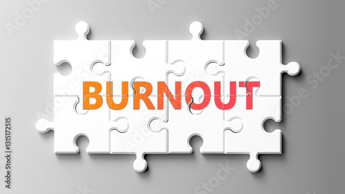 Burnout complex like a puzzle - pictured as word burnout on a puzzle pieces to show that burnout is complex and needs cooperating pieces that fit together. ,3d illustration