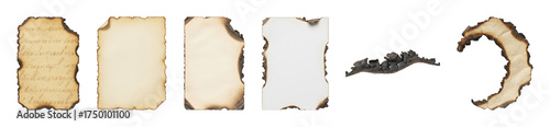Burnt paper set including aged, blank, charred, and curled pieces isolated. Vintage document and graphic design elements.