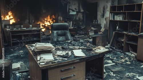 Burnt-out office with charred documents and furniture, Failure, corporate liquidation