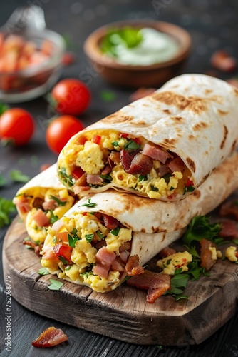Burrito Filled With Eggs and Bacon on Cutting Board
