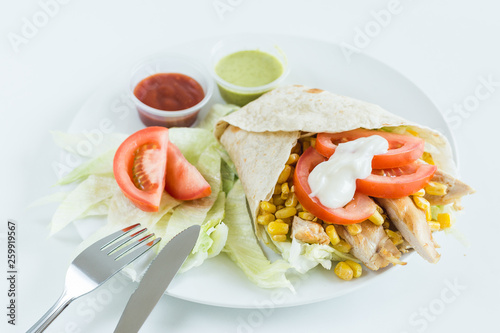 Burrito wrap with tomato, corn, lettuce, chicken, mayonnaise and sauces with white background