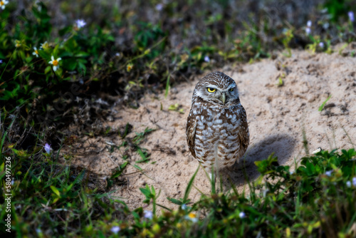 Burrowing Owls are small, sandy colored owls with bright-yellow eyes. They live underground in burrows they’ve dug themselves or taken over from a prairie dog, ground squirrel, or tortoise