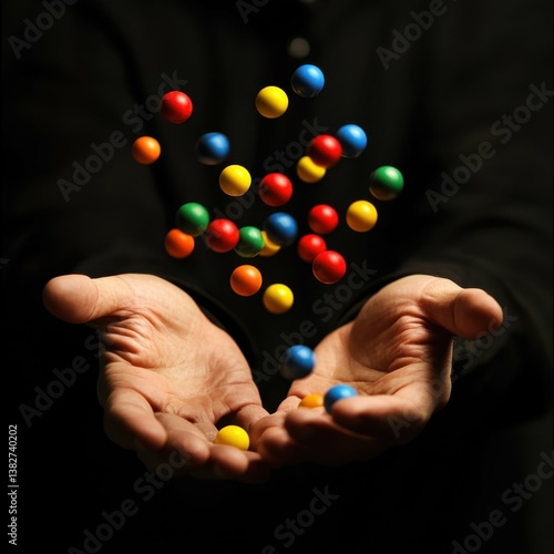 Burst of colorful spheres floating above caucasian male hands in dark background