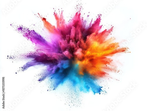 burst of vivid color powder against a crisp white background, capturing the energy and chaos of an explosion in dynamic detail; isolated splashes emphasize creativity and freedom of expression