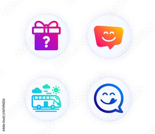 Bus travel, Secret gift and Smile face icons simple set. Button with halftone dots. Yummy smile sign. Transport, Unknown package, Chat. Emoticon. Holidays set. Gradient flat bus travel icon. Vector