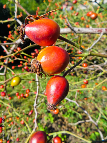 Bush of dog rose (briar, rosa) with ripe berries