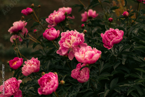 Bush of pink peonies blooming with rich green foliage
