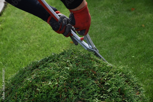Bush or shrub cutting with garden scissors. Forming thuja sphere by pruning shear