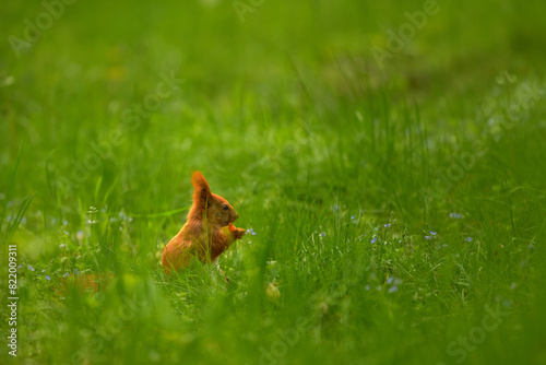 Bushy-tailed red squirrel has a meal in the wild