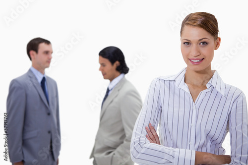 Busiensswoman with arms folded and talking colleagues behind her