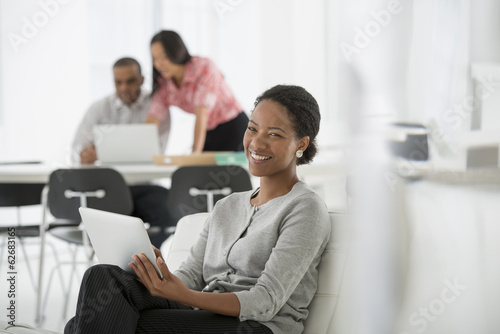 Business. A Woman Sitting Down Using A Digital Tablet. Two People In The Background Looking At A Computer Screen.