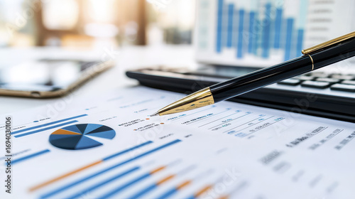 Business analysis report with charts, graphs, and pen on desk, showcasing financial data and statistics