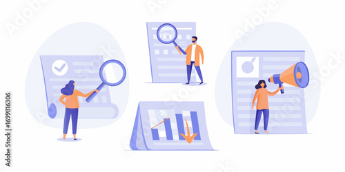 Business analytics concept with people analyzing charts and documents using magnifying glass and megaphone
