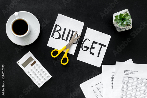 Business and accountant concept with coffee, sciccors, cut budget copy and calculator black office background top view