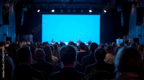 Business and entrepreneurship symposium. Speaker giving a talk at business meeting. Audience in the conference hall. Rear view of unrecognized participant in audience