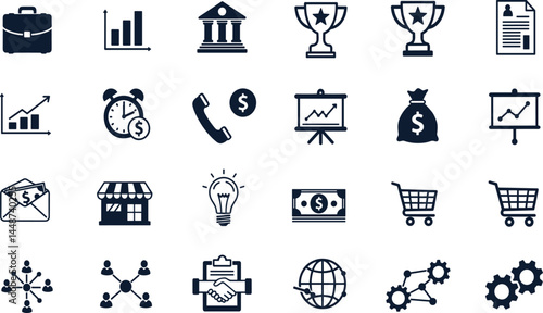 Business and finance icon set. Vector glyph pictograms of briefcase, chart, money, banking, accounting, handshake, calendar, corporate, marketing, investment concept black silhouette