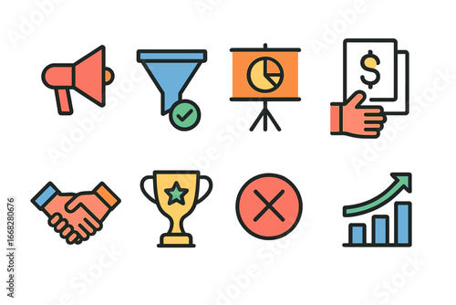Business and Finance Icons: Megaphone, Funnel, Presentation, Handshake, Trophy, Growth Chart