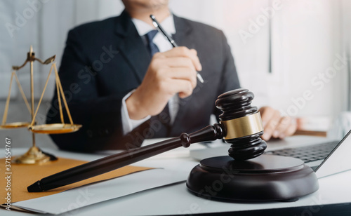 Business and lawyers discussing contract papers with brass scale on desk in office. Law, legal services, advice, justice and law concept picture with film grain effect