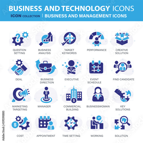 Business and marketing, management, find job, meeting, teamwork collection. Set of blue icons set. Flat vector illustration