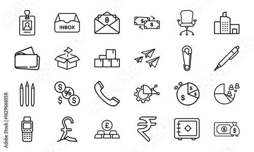 Business and Office Icon Bundle – Finance, Currency, Communication, Charts, ID, Pen, Office Tools, Safe, and Company Line Icons for Corporate Design and UI