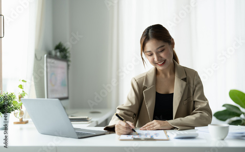 Business asian woman using laptop for do math finance on wooden desk in office, tax, accounting, financial concept
