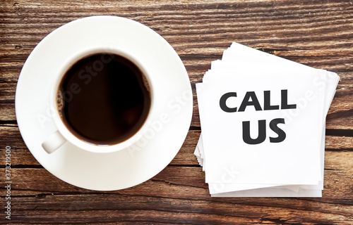 Business CALL US . White stickers with text on the wooden background with coffee