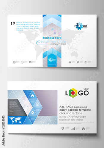 Business card templates. Cover design template, easy editable blank, abstract flat layout. Molecule structure on blue. Science healthcare background, medical vector.