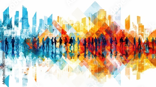 Business collage with professionals, handshakes, cityscapes, and collaboration in geometric pattern.