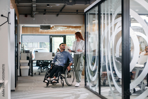 Business colleagues, collaborative business colleagues, including a person in a wheelchair, walk past a modern glass office corridor, illustrating diversity, teamwork and empowerment in the workplace.
