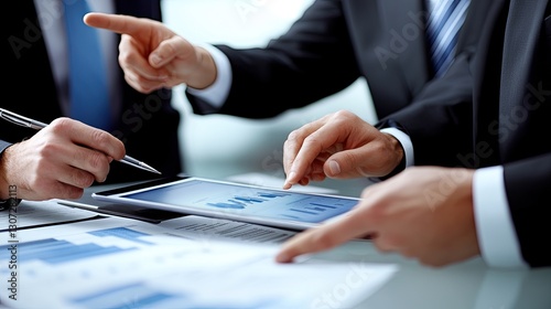 Business colleagues discussing financial data on a tablet in a modern office setting.