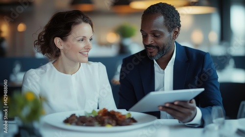 Business colleagues review documents over lunch, discussing plans and strategies while enjoying a meal together.
