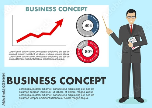 Business concept. Businessman near whiteboard and pointing on the chart of finance analytics. Graph with trend line rising up and coin with sign of dollar in flat style isolated. Vector illustration