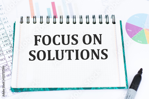 Business concept. On the business charts lies a magnifying glass, a pen and a sign with the inscription - Focus On Solution