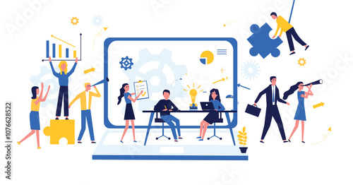Business concept. Team metaphor. People connect puzzle elements. Flat illustration in flat design style. Teamwork, collaboration, partnership. Businessmen working together and moving towards success.